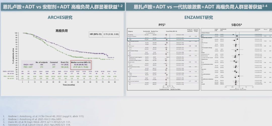 他指出,以恩扎卢胺为基础的联合治疗方案,单用恩扎卢胺加上ADT本身即可达到显著获益。在ARCHES研究中,高瘤负荷患者的中位OS已长达83个月,这是一个明显的进步。
