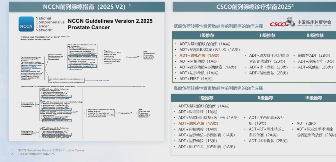对于转移性激素敏感性前列腺癌(mHSPC)而言,总的治疗目标是“活得更长、活得更好”,而中期的目标则是提高前列腺特异性抗原(PSA)的反应率。恩扎卢胺作为新型内分泌治疗药物,在mHSPC的治疗中具有明显的先发优势,其是继阿比特龙之后,第一个进入临床的二代抗雄药物。目前,恩扎卢胺已在NCCN指南和国内CSCO指南中获得广泛推荐,用于一线治疗转移性激素敏感性前列腺癌,无论是低瘤负荷还是高瘤负荷患者。