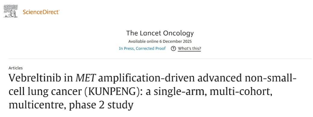 Wu,Yi-Long et al."Vebreltinib in MET Amplification-Driven Advanced Non-Small-cell Lung Cancer(KUNPENG):a Single-Arm,Multi-Cohort,Multicentre,Phase 2 Study",The Lancet Oncology 27.1(2025):36-44.