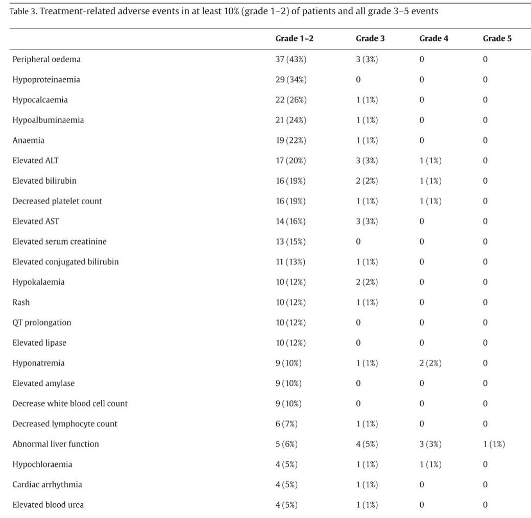 任何级别治疗相关不良反应发生率为91.0%,最常见的治疗相关不良反应,包括水肿44%,低白蛋白血症34%,低钙血症26%。3度及以上治疗相关不良反应发生率为31%,主要为肝功能异常9%,严重不良反应发生率为19%。12%的患者永久性终止治疗,因不良反应导致剂量降低的比例为10%。