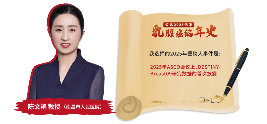 本期栏目,南昌市人民医院陈文艳教授选择以德曲妥珠单抗(T-DXd)联合帕妥珠单抗(P)方案,用于HER2阳性晚期乳腺癌一线治疗的DESTINY-Breast09(DB-09)研究成功,作为2025年度HER2阳性乳腺癌领域最关注的大事件,指出T-DXd+P方案在DB-09研究中取得长达40.7个月的中位无进展生存期(PFS),刷新了HER2阳性晚期乳腺癌一线治疗的PFS疗效纪录,因此也将成为T-DXd改写诊疗格局的又一次里程碑事件,期待该方案用于我国临床。