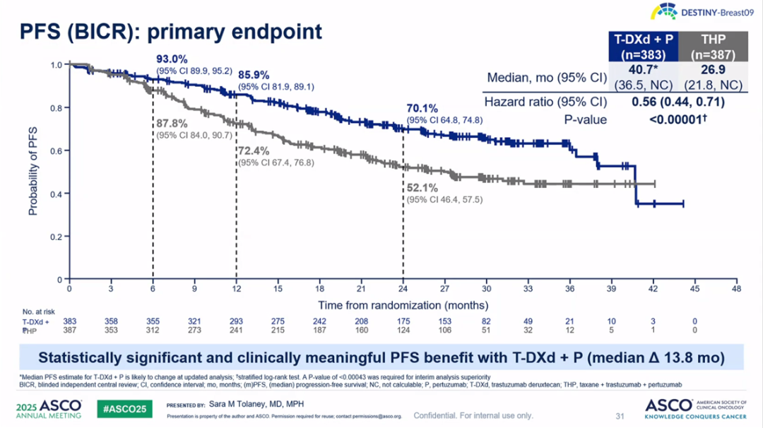 DESTINY-Breast09研究T-DXd+P组及THP组由BICR评估的PFS对比