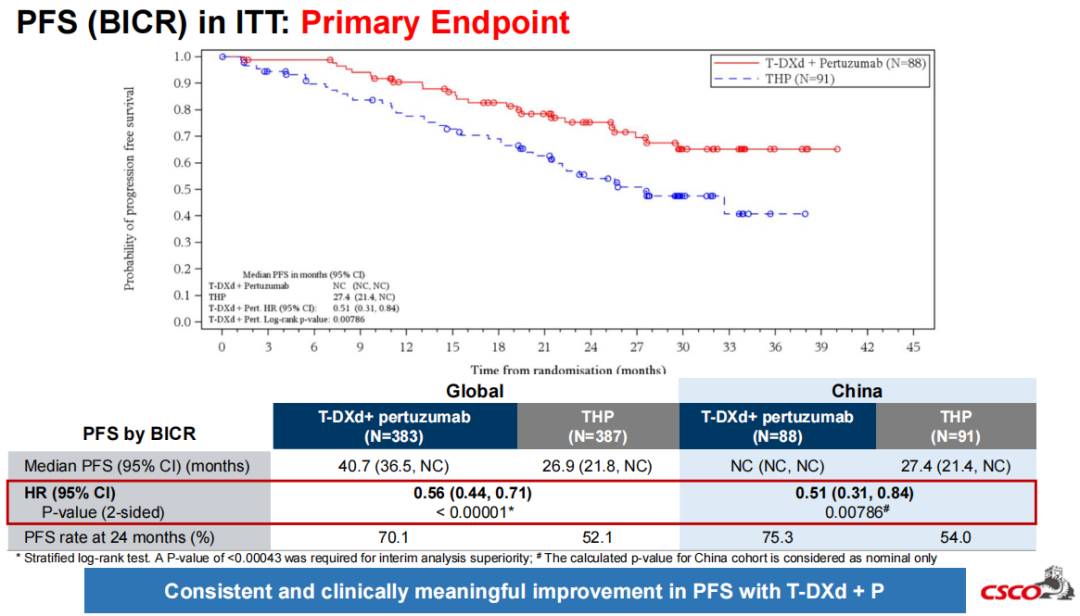 DB-09研究是自2012年THP方案被确立为标准一线治疗以来,HER2阳性晚期乳腺癌一线治疗的首个重磅突破,也是全球首个挑战HP双靶方案并取得成功的Ⅲ期研究,无疑可载入HER2阳性乳腺癌治疗史册;该研究是一项全球多中心、随机、开放标签Ⅲ期临床研究,对入组患者分别给予T-DXd单药治疗、T-DXd+P方案及THP方案一线治疗。2025 ASCO大会上,披露了研究T-DXd+P组及THP组的全人群期中分析疗效数据,两组由盲态独立中心评估(BICR)的mPFS为40.7个月对26.9个月,T-DXd+P方案治疗使患者疾病进展或死亡风险显著降低44%(HR 0.56,95%CI:0.44-0.71,P<0.00001),且各亚组均有一致的PFS获益。