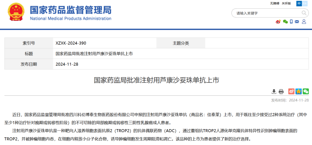 2024年NMPA批准芦康沙妥珠单抗上市