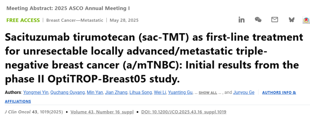 [8]Yin Y,et al.Sacituzumab tirumotecan(sac-TMT)as first-line treatment for unresectable locally advanced/metastatic triple-negative breast cancer(a/mTNBC):Initial results from the phase II OptiTROP-Breast05 study.ASCO 2025;Abstract#1019