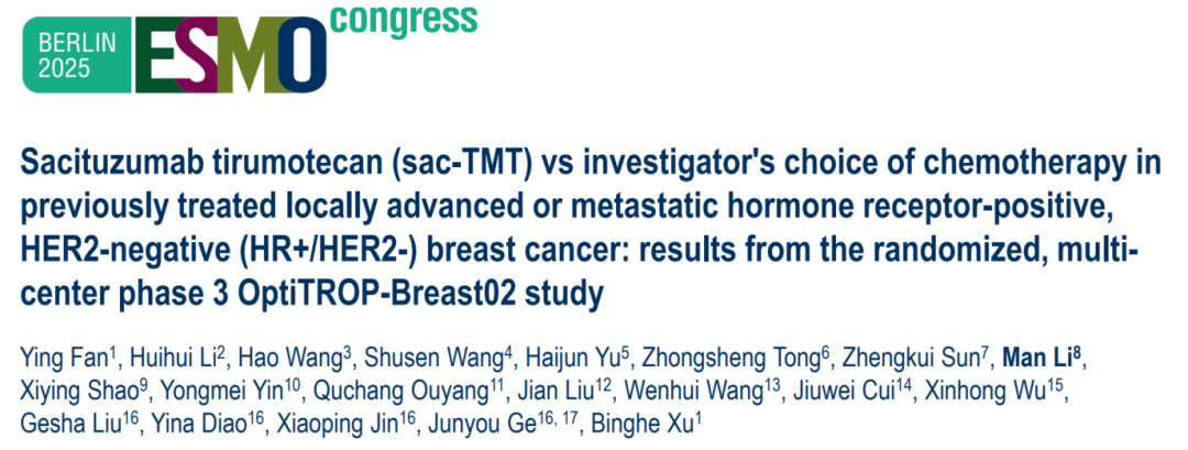 [9]Man L,Ying F,et al.Sacituzumab tirumotecan(sac-TMT)vs investigator’s choice of chemotherapy(ICC)in previously treated locally advanced or metastatic hormone receptor-positive,HER2-negative(HR+/HER2-)breast cancer(BC):Results from the randomized,multi-center phase III OptiTROP-Breast02 study.2025 ESMO LBA 23.Annals of Oncology(2025)36(suppl_2):S1-S60.10.1016/annonc/annonc1965
