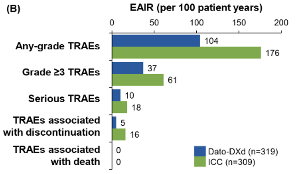 Dato-DXd与化疗组≥3级治疗相关不良事件(TRAE)发生率类似,分别为33%vs 29%。在按暴露时间调整后,Dato-DXd组总体TRAE的暴露调整不良事件发生率(EAIR,104 vs 176患者年)以及≥3级TRAE的EAIR(37 vs 61患者年)均远远低于化疗组。需要明确的是,因为Dato-DXd较化疗的治疗时间更长,似乎累积的不良事件更多,但按暴露时间调整后,Dato-DXd在单位时间的不良事件发生率远低于化疗,具有更好的安全性优势。此外,在临床关注的口腔毒性与眼部毒性方面,Dato-DXd呈现出“程度轻、可逆转”的特点;间质性肺病(ILD)发生率为2.8%,多为1-2级,在临床实践中比较安全、好控制。
