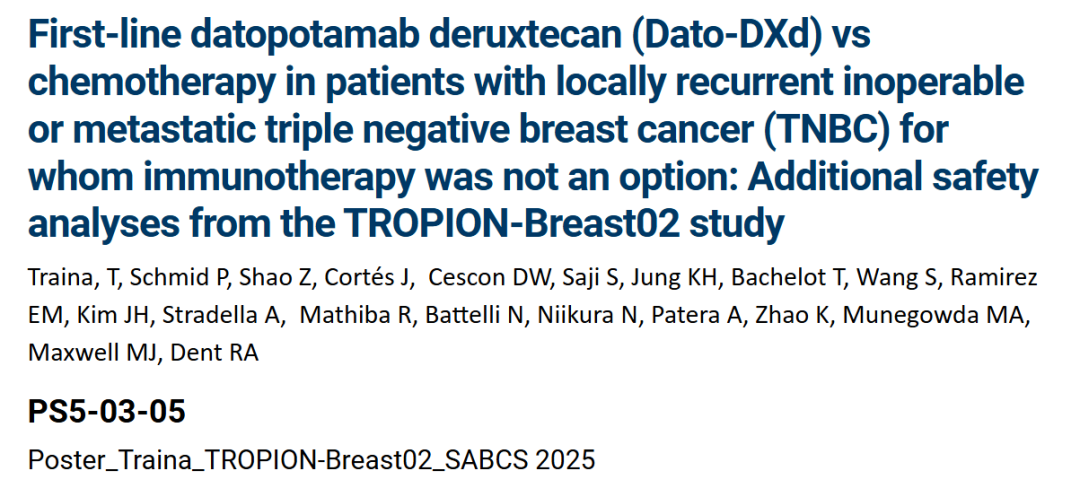 [6]Tiffany A.Traina,et al.First-line(1L)datopotamab deruxtecan(Dato-DXd)vs chemotherapy in patients(pts)with locally recurrent inoperable or metastatic triple negative breast cancer(TNBC)for whom immunotherapy was not an option:Additional safety analyses from the TROPION-Breast02 study.2025 SABCS.Abstract PS5-03-05.