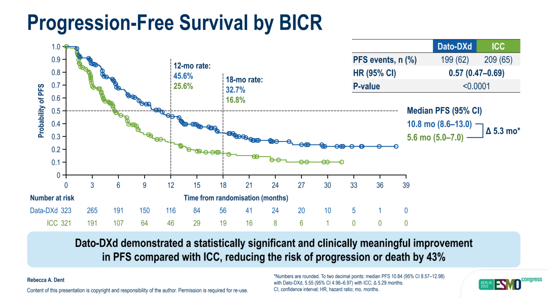 研究结果显示,Dato-DXd组较化疗组在盲态独立评审委员会(BICR)评估的mPFS方面显著延长5.3个月,为10.8个月vs 5.6个月,疾病进展或复发风险降低43%(HR 0.57,95%CI:0.47-0.69,P<0.0001)。研究者评估的PFS与BICR评估的PFS一致。