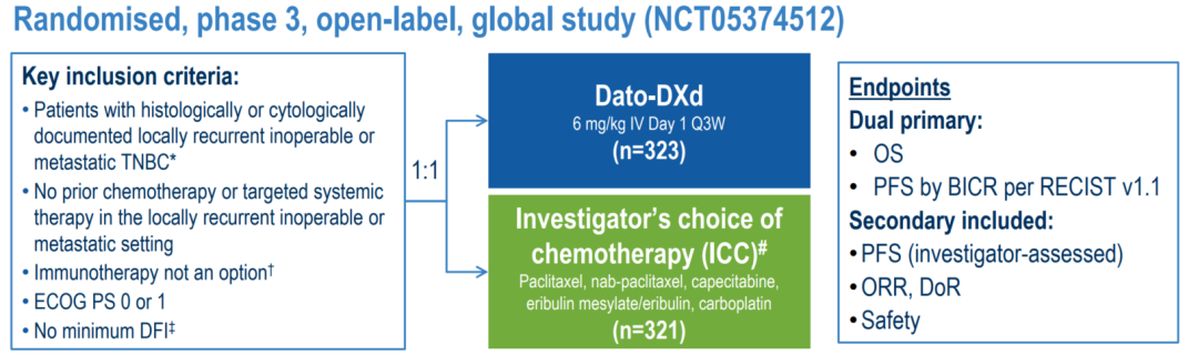 2025年10月,ESMO年会公布了III期TROPION-Breast02研究初步分析结果[5]。该研究于2022年启动,在全球纳入644例PD-L1阴性、以及PD-L1阳性但无法接受免疫治疗的晚期TNBC患者,按1:1分组后予以Dato-DXd和研究者选择的化疗方案(ICC,含紫杉醇、卡培他滨、艾立布林等)一线治疗。
