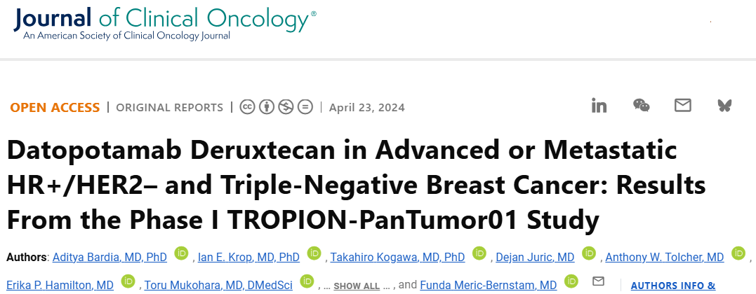[2]Bardia A,Krop IE,Kogawa T,et al.Datopotamab Deruxtecan in Advanced or Metastatic HR+/HER2-and Triple-Negative Breast Cancer:Results From the Phase I TROPION-PanTumor01 Study.J Clin Oncol.2024 Apr 23:JCO2301909.