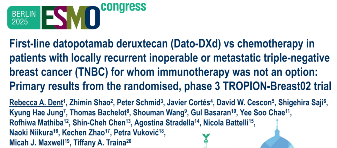 [5]Rebecca A.Dent,et al.First-line(1L)datopotamab deruxtecan(Dato-DXd)vs chemotherapy in patients with locally recurrent inoperable or metastatic triple-negative breast cancer(mTNBC)for whom immunotherapy was not an option:Primary results from the randomised,phase 3 TROPION-Breast02 trial.2025 ESMO LBA21