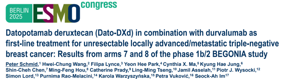 [4]Schmid P et al.Datopotamab deruxtecan(Dato-DXd)+durvalumab(D)as first-line(1L)treatment(tx)for unresectable locally advanced/metastatic triple-negative breast cancer(a/mTNBC):Final results from the phase Ib/II BEGONIA study.2025 ESMO 555MO.