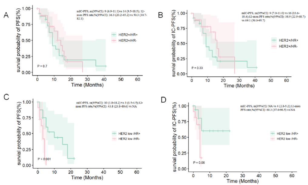 图3.不同队列中总PFS和IC-PFS的Kaplan-Meier曲线:(A)HER2+队列的PFS;(B)HER2+队列的IC-PFS;(C)HER2低表达/零表达队列的总PFS;(D)HER2低表达/零表达队列的IC-PFS