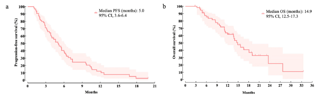 安全性:因不良事件导致的治疗中断发生在7例(8.0%)患者中,其中经济毒性为主要原因(4例,4.6%)。最常见的治疗期间出现的不良事件(TEAEs)包括疲劳(45.9%)、食欲下降(25.2%)和恶心(11.4%)。大多数3级及以上不良事件为血液学毒性,包括6例(6.9%)中性粒细胞减少症和4例(4.6%)血小板减少症。ILD发生在7例(8.0%)患者中,其中2例(2.3%)确诊为3级ILD并中断治疗。本真实世界队列中未发现新的安全性信号。