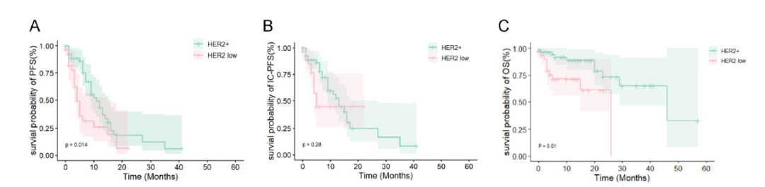 图2.HER2阳性和HER2低表达队列的Kaplan-Meier曲线,包括PFS、IC-PFS和OS
