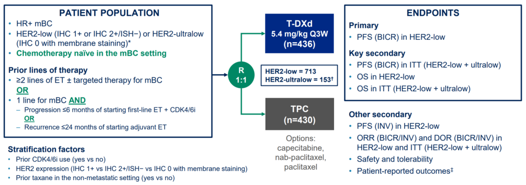 该研究主要纳入866例内分泌经治、但化疗未经治的HR阳性晚期乳腺癌患者,其中包括辅助治疗后2年内复发的患者、以及CDK4/6抑制剂经治患者,贴合临床实践状况,同时覆盖了HER2低表达和HER2超低表达人群。患者按1:1随机分组后分别予以T-DXd和医生选择的化疗方案(TPC)。主要终点为盲态独立评审委员会(BICR)评估的HER2低表达人群无进展生存期(PFS);关键次要终点包括意向肿瘤人群(ITT)的PFS,HER2低表达的总生存期(OS),ITT人群的OS,安全性等。