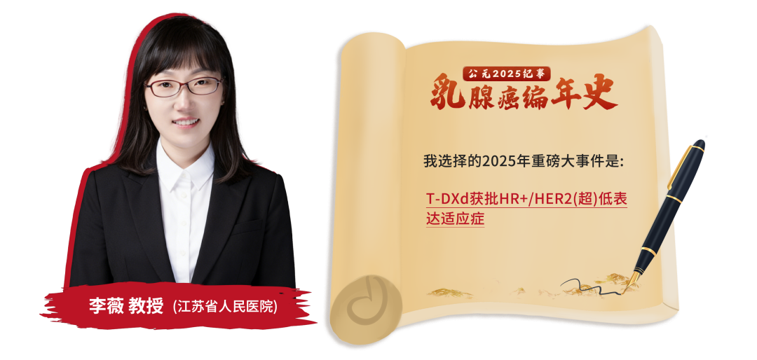 本期栏目,江苏省人民医院李薇教授将2025最值得关注的里程碑事件赋予给德曲妥珠单抗(T-DXd)获批HR阳性/HER2(超)低表达适应症,指出该适应症的更新不仅将抗HER2治疗边界扩大到了HER2超低表达领域,还将HR阳性/HER2阴性晚期乳腺癌的抗HER2治疗门槛由过去的“至少经历一次化疗”提前至“至少经历一次内分泌治疗”,将使更多患者从抗HER2治疗中取得获益。