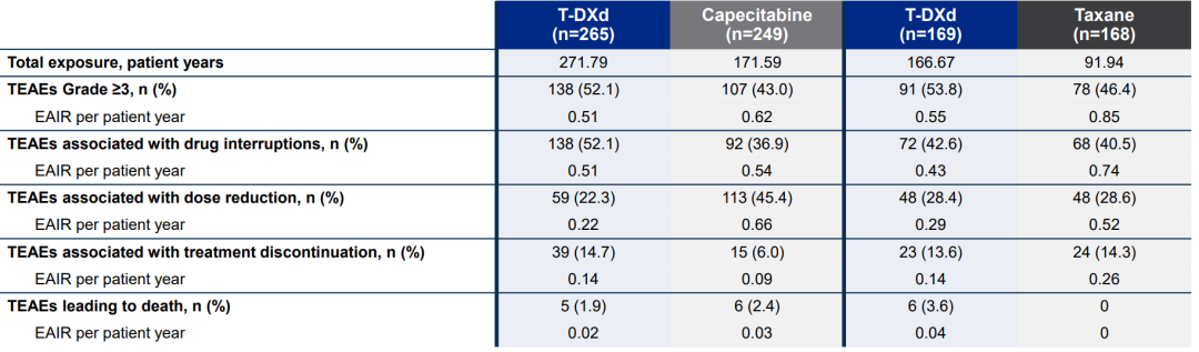 2025年5月,欧洲肿瘤内科学会乳腺癌年会(ESMO BC)公布的DESTINY-Breast06研究事后分析表明T-DXd并不影响后续治疗获益,并进一步证明了安全性。T-DXd与化疗的≥3级治疗相关不良事件的发生率为40.6%vs 31.4%,在按暴露时间调整后,T-DXd较卡培他滨的≥3级不良事件的暴露调整不良事件发生率(EAIRs)更低,为0.51 vs 0.62患者年;T-DXd相较于紫杉类的这一数值为0.55 vs 0.82,提示单位时间内,T-DXd的安全性较化疗更具优势[12]。