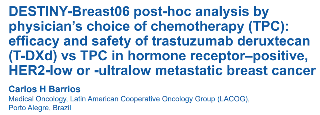 [12]Carlos H.Barrios,et al.DESTINY-Breast06(DB-06)post-hoc analysis by physician’s choice of chemotherapy(TPC):Efficacy and safety of trastuzumab deruxtecan(T-DXd)vs TPC in hormone receptor–positive(HR+),HER2-low or-ultralow metastatic breast cancer(mBC).ESMO BC;299MO