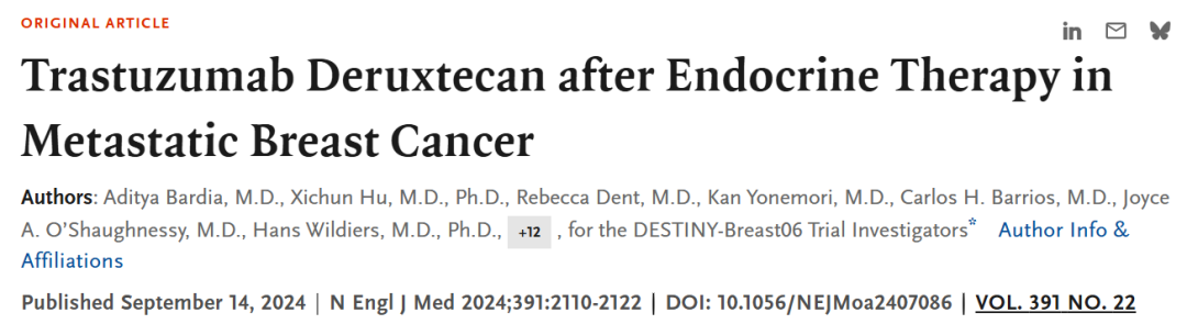 [7]Bardia A,Hu X,Dent R,et al.Trastuzumab Deruxtecan after Endocrine Therapy in Metastatic Breast Cancer.N Engl J Med.2024;391(22):2110-2122.doi:10.1056/NEJMoa2407086