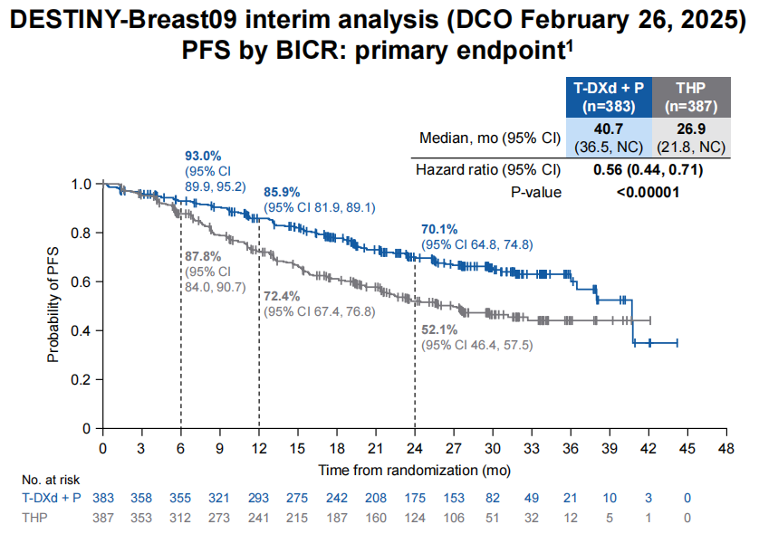 而在2025年,T-DXd还相继取得用于晚期一线治疗的DB-09研究、用于早期患者新辅助治疗的DB-11研究、新辅助治疗后未达病理学完全缓解(non-pCR)患者强化辅助治疗的DB-05研究成功,疗效均较对照组的原标准治疗方案明显提升,例如在DB-09研究中,T-DXd联合帕妥珠单抗取得目前一线治疗最长的40个月PFS;在DB-11研究中,T-DXd-THP新辅助治疗方案也报告了67.3%的pCR率,为新辅助治疗III期临床研究目前最高pCR率;DB-05研究中T-DXd作为强化辅助治疗,使患者浸润性疾病复发或死亡风险较T-DM1组显著下降53%。