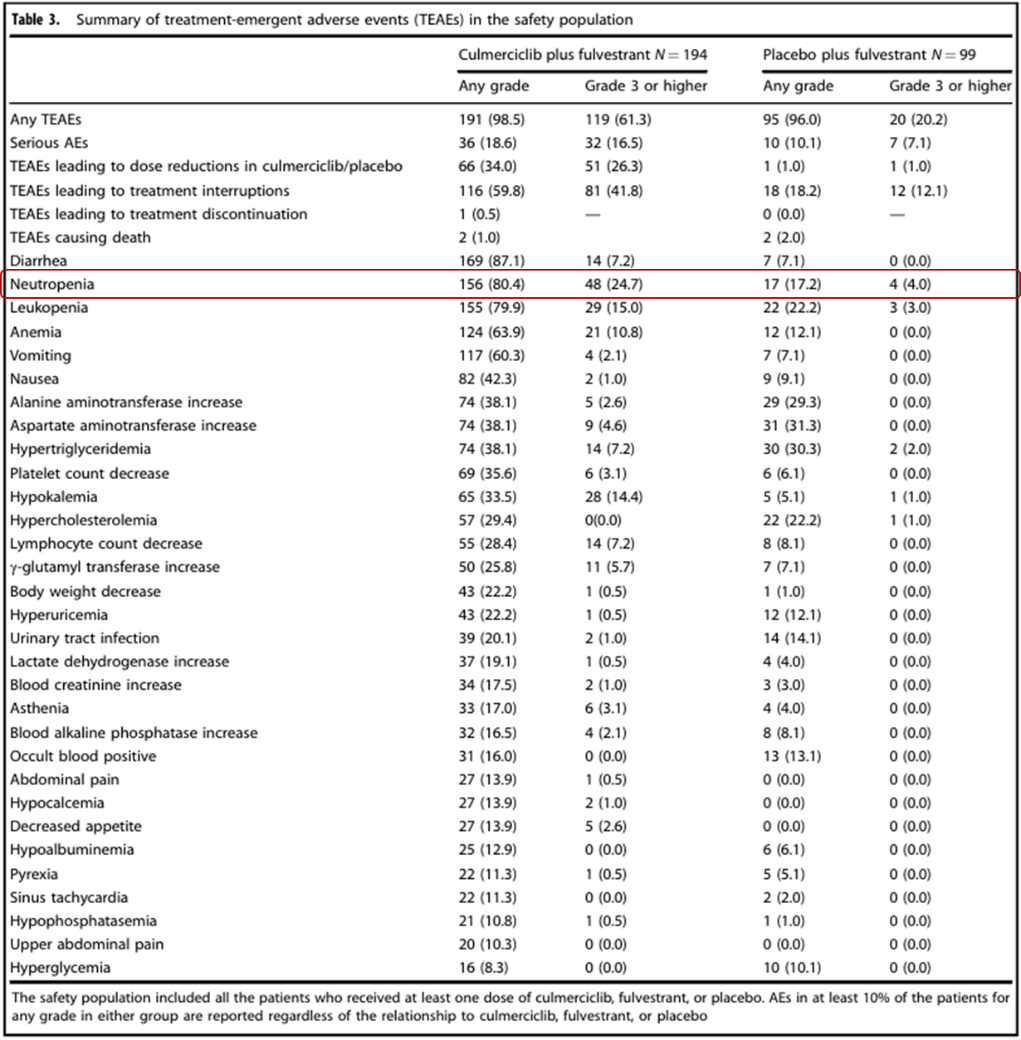 在安全性分析方面,库莫西利联合氟维司群组治疗相关不良事件(TRAE)多为1-2级;值得一提的是,未见因不良事件导致的治疗终止情况,与传统CDK4/6抑制剂相比,具有更低的骨髓抑制风险,为长期治疗的依从性提供了有效保障。库莫西利组治疗期间所有≥3级TRAE的发生率为65.2%。大家最为关心的中性粒细胞降低发生率虽为80.4%,但3级以上仅占24.7%,显著降低了临床用药的担忧,为实际用药带来了极大的便利性和安全性。