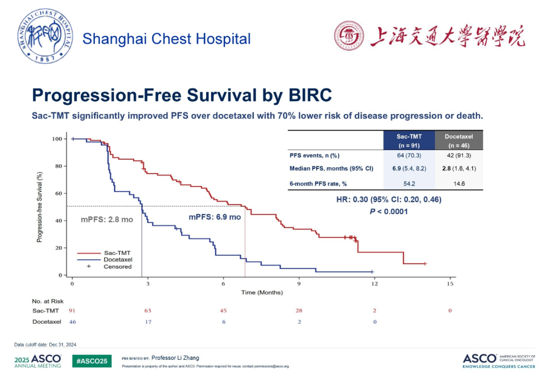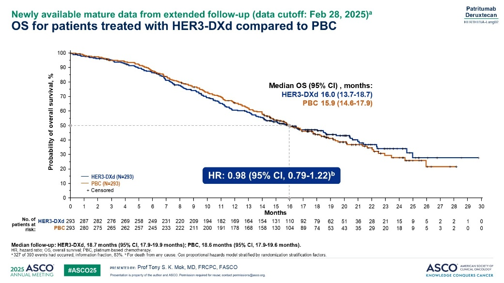 2025年ASCO公布了该药三线治疗耐药以后患者的数据,即OptiTROP-LUNG-03研究数据。该研究纳入携带EGFR敏感突变且接受靶向治疗及含铂双药化疗后出现疾病进展的患者,按2:1的比例随机分为标准剂量芦康沙妥珠单抗或多西他赛治疗,主要研究终点为ORR。最终,两组分别入组91例和45例患者,ORR分别为45.1%和15.6%,P=0.0004,DCR分别为75%和27%,两组中位OS均未达到,HR=0.49,P=0.007;两组中位PFS分别为6.9个月和2.8个月,HR=0.30,3度及以上治疗相关不良反应发生率分别为56%和71.7%,严重治疗相关不良反应发生率分别为16.5%和41.3%。