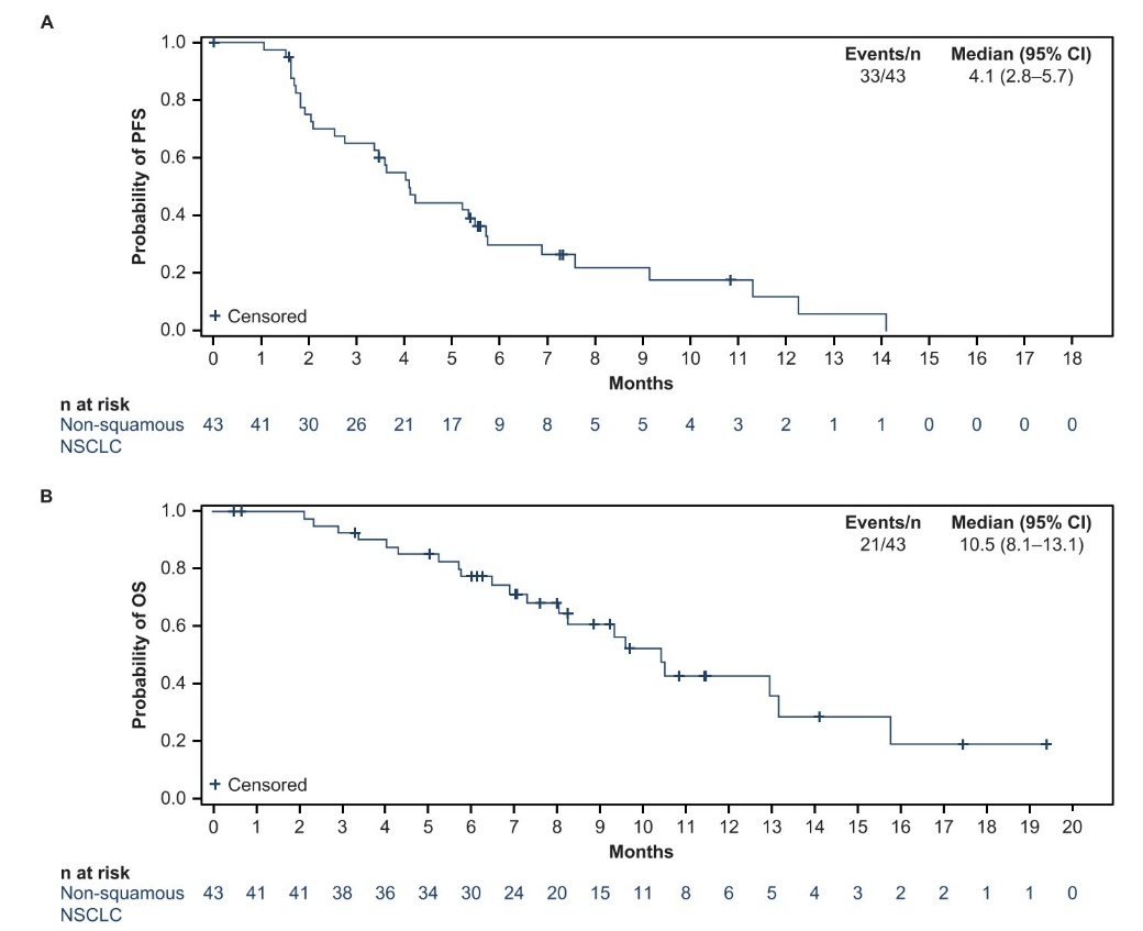 鳞癌患者第一阶段入组时,仅有1例患者出现客观响应,基于期中分析结果,研究被提前终止。该队列的中位随访时间10.6个月,ORR为4.3%,DCR为60.9%,中位PFS和中位OS为3.5个月和8.2个月。非鳞癌患者在首次期中分析时,3例患者出现客观响应,因此,进一步入组至40例,但最终缓解的患者小于预设标准。患者整体ORR为14%,DCR为67.4%,中位PFS和中位OS分别为4.1个月和10.5个月。经过中位23.5个月的随访更新,患者的中位OS为13.0个月,ORR为16.3%。