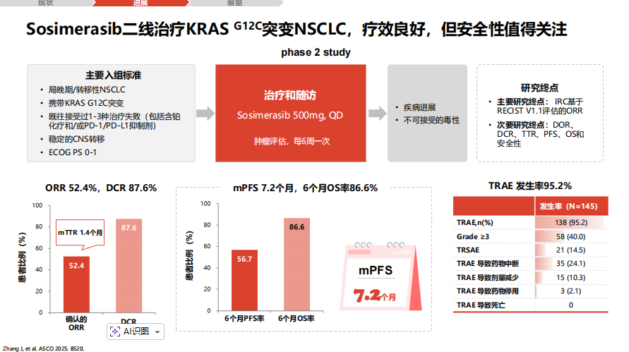 此外,在2025年美国临床肿瘤学会(ASCO)年会上公布的一项II期研究,评估了新型口服高选择性KRAS G12C抑制剂Sosimerasib在经治患者中的表现。BIRC评估的ORR为52.4%,DCR为87.6%,mPFS为7.2个月,6个月总生存率为86.6%。该研究同时提示,尽管疗效明确,但其安全性需引起重视:总体耐受性良好,任何级别治疗相关不良事件发生率达95.2%,其中≥3级事件占40.0%,导致治疗中断和剂量减少的比例分别为24.1%和10.3%,提示在实际临床应用中对毒性的主动管理至关重要[4]。