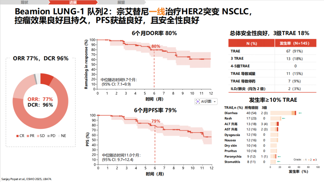 Beamon LUNG-1研究:在经治的HER2 TKD突变患者(队列1)中,ORR高达71%,DCR达96%,mPFS为12.4个月,且安全性显著优于ADC,未报告药物相关ILD,≥3级TRAE仅17%,导致停药率仅3%[16、17]。同时,该药在一线治疗(队列2)及脑转移患者(队列4)中也显示出卓越潜力[18]。
