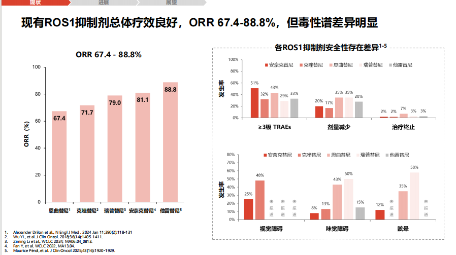 目前已有多款ROS1抑制剂应用于临床,总体ORR在67.4%-88.8%之间,但各药物的毒性谱(如肝毒性、神经系统毒性等)存在差异,临床需个体化选择[20-24]。
