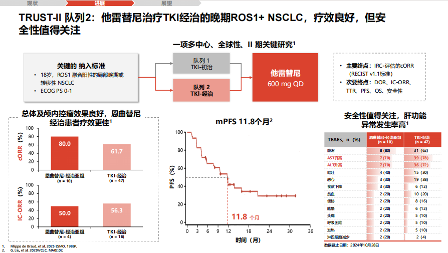 TRUST-II全球研究显示,对于TKI经治患者,ORR为62%,mPFS为11.8个月,且对恩曲替尼经治者疗效更佳。但其肝功异常(ALT/AST升高)发生率较高(约70%),需密切监测[25-26]。