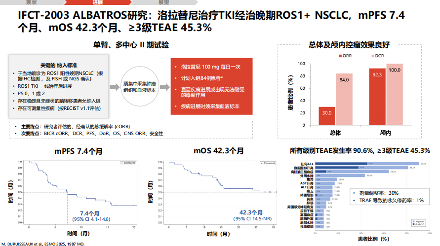 ARROS-1研究表明,该药对TKI初治和经治患者均有效。初治患者ORR高达89%,经治患者ORR为44%。颅内活性突出,且安全性良好,常见不良事件为外周水肿、便秘等,肝毒性较低[28]。