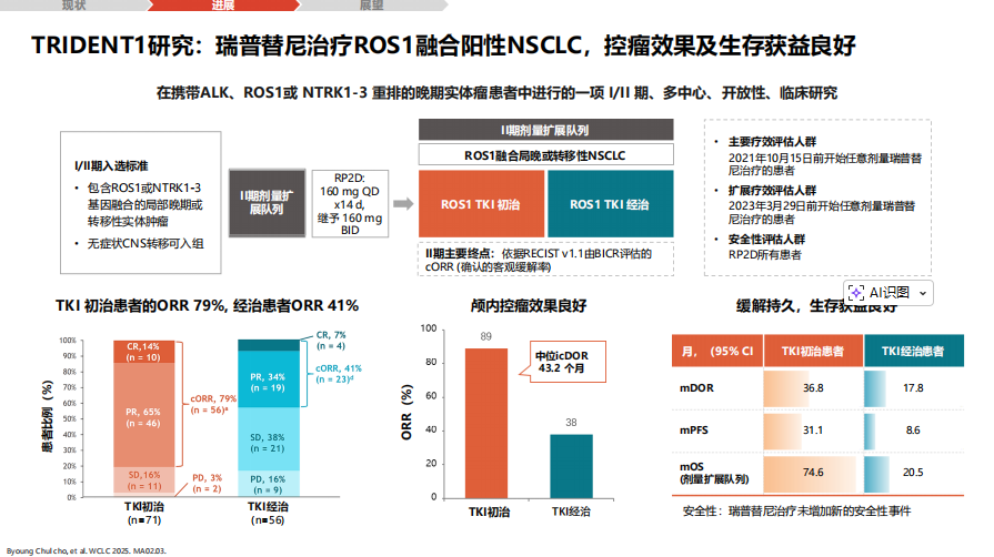 TRIDENT-1研究长期随访数据稳固了其优势地位。在TKI初治患者中,ORR达79%,mPFS长达31.1个月,mOS达74.6个月;在经治患者中ORR为41%。其对脑转移控制效果卓越,颅内ORR达89%[29]。