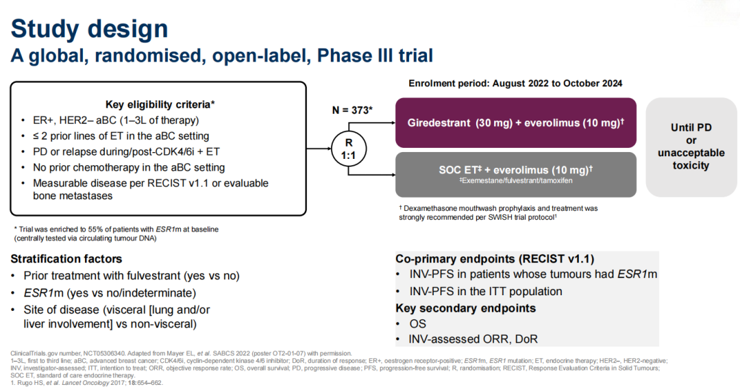 [3]、Erica Mayer,et al.Giredestrant(GIRE),an oral selective oestrogen receptor(ER)antagonist and degrader,+everolimus(E)in patients(pts)with ER-positive,HER2-negative advanced breast cancer(ER+,HER2–aBC)previously treated with a CDK4/6 inhibitor(i):Primary results of the Phase III evERA BC trial ESMO 2025.Abstract LBA 16.