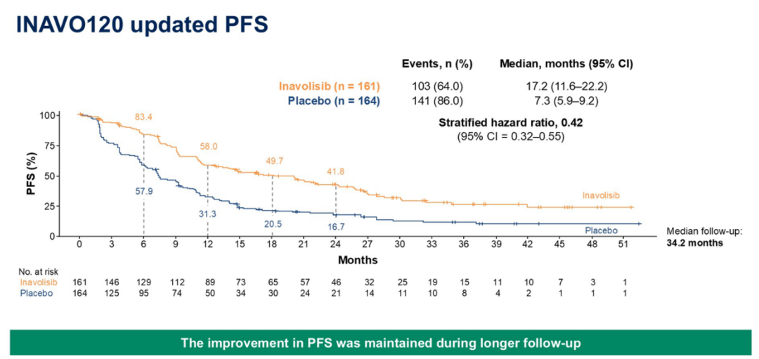此外,INAVO123研究目前正在进行中。该研究为一项III期、多中心、随机、双盲、安慰剂对照试验,旨在评估伊那利塞联合CDK4/6抑制剂(哌柏西利)和来曲唑,对比安慰剂联合哌柏西利和来曲唑,用于内分泌治疗敏感、PIK3CA突变型HR+/HER2-晚期乳腺癌一线治疗的有效性与安全性。期待其结果早日公布。