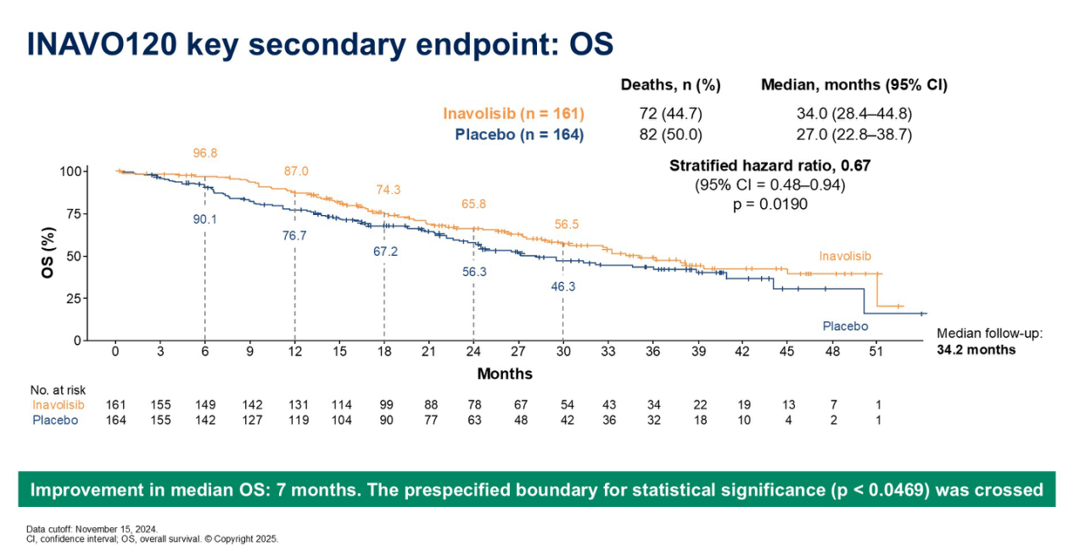 2025年ASCO大会上,INAVO120研究的PFS数据进行了更新,伊那利塞组和安慰剂组的中位PFS分别为17.2个月(95%CI:11.6~22.2)和7.3个月(95%CI:5.9~9.2)(HR 0.42;95%CI:0.32~0.55)。次要终点OS数据显示,伊那利塞组中位OS长达34个月,较安慰剂组的27个月显著延长7个月,整体死亡风险降低33%(HR 0.67,95%CI:0.48-0.94,P=0.0190)。这一三药联合方案,为HR+/HER2-晚期乳腺癌患者的一线治疗拓展了新的探索空间。