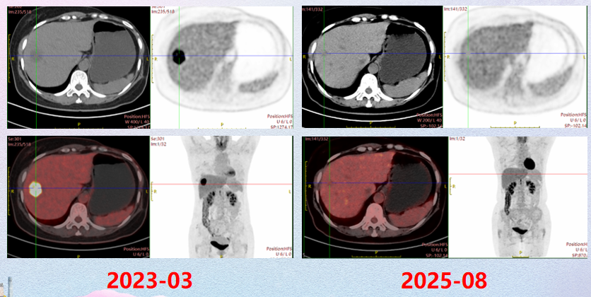 患者后续继续外院规律治疗,定期来院门诊复查,评估颅脑及骨ECT,未见明显异常;2025年8月患者来院进行PET/CT检查,示原肝脏VIII段稍低密度团块,形态较前缩小,FDG代谢未见异常增高,疗效评估为CR。