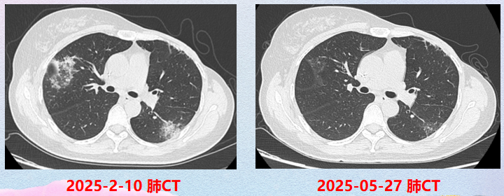 患者再发咳嗽、咳痰症状,遂进一步完善胸部CT:右肺上叶、左肺下叶炎症,较前新增;CRP 60.4mg/L;甲乙流新冠核酸阴性。呼吸内科会诊后,建议莫西沙星经验性抗感染治疗后复查,暂停T-DXd治疗;后续患者于当地复查,经治疗肺部感染好转后,继续T-DXd治疗。