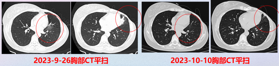 患者出现咳嗽,咳白痰,遂完善胸部CT检查(2023.09.26),提示两肺炎症,首先考虑感染性,遂予莫西沙星经验性抗感染治疗、暂停T-DXd治疗;2周后复查胸部CT,肺部炎症较前好转,遂继续予T-DXd治疗。