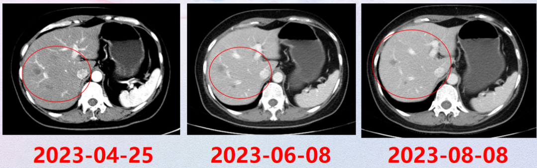 治疗4个周期后(2023.06.08),患者复查CT肝脏病灶疗效评估达到PR并维持,随后因胃肠道不良反应,胃纳差,体重下降,遂降低T-DXd剂量至4.4mg/kg继续治疗。