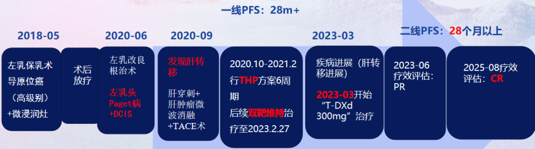 该病例为47岁的HER2阳性晚期乳腺癌患者,左乳癌术后2年余新发肝转移,接受THP方案一线治疗约28个月后肝转移进展,遂自2023年3月起二线换用T-DXd进行治疗,取得良好疾病控制疗效,治疗4周期后达到PR,且2025年8月末次复查时疗效更进一步达到CR;治疗过程中虽两次出现肺炎症状暂停用药,但均为感染性而非T-DXd相关ILD,暂停T-DXd并予抗感染治疗后均可顺利缓解,患者治疗期间也仅出现T-DXd较常见的相关胃肠道反应,未对治疗过程造成干扰,为T-DXd用于THP方案治疗失败后的HER2阳性晚期乳腺癌患者,提供了证实其出色疗效的我国真实病例证据。