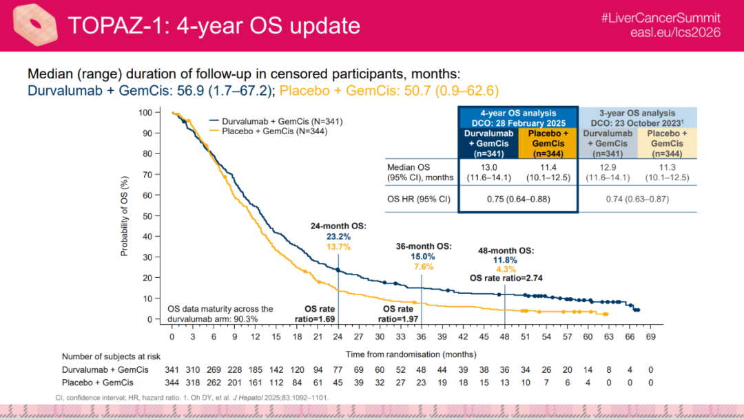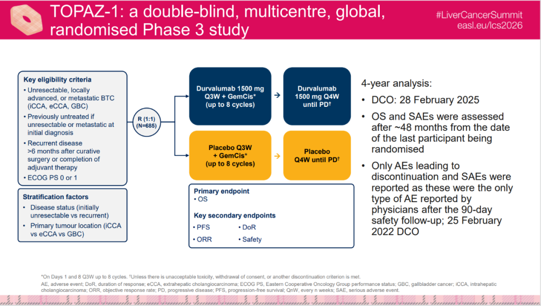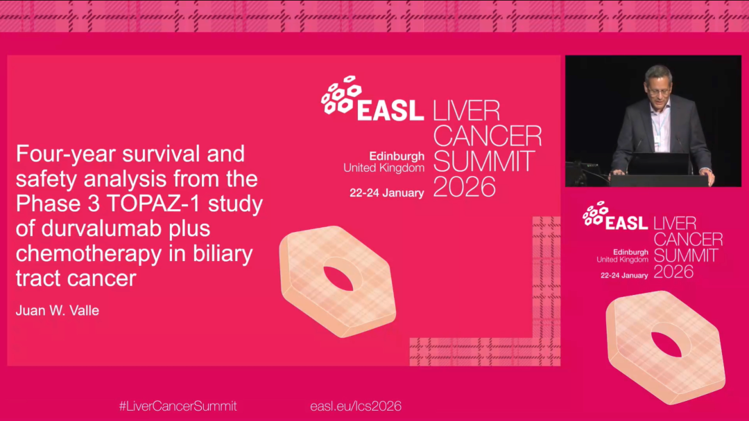 编者按:2026年1月22-24日,EASL肝癌峰会在英国爱丁堡顺利召开。国际多中心Ⅲ期临床试验TOPAZ-1的4年生存与安全性最终分析结果正式公布。英国曼彻斯特大学和克里斯蒂NHS基金会Juan Valle教授以《度伐利尤单抗联合化疗治疗胆道癌的Ⅲ期TOPAZ-1研究的4年生存及安全性分析》(摘要号:OS-3)为题汇报了核心数据:度伐利尤单抗联合吉西他滨+顺铂化疗方案,为晚期胆道癌患者带来了持续且具有临床意义的生存改善,4年总生存率较单纯化疗提升近3倍,且长期安全性良好。这是首个报告联合免疫化疗方案治疗晚期胆道癌四年总生存期(OS)的随机Ⅲ期研究,进一步巩固了该组合作为此类患者一线标准治疗的地位。让我们跟随Juan Valle教授的讲述,见证一场胆道癌治疗领域的非凡突破,重新定义晚期胆道癌患者的长期生存可能。