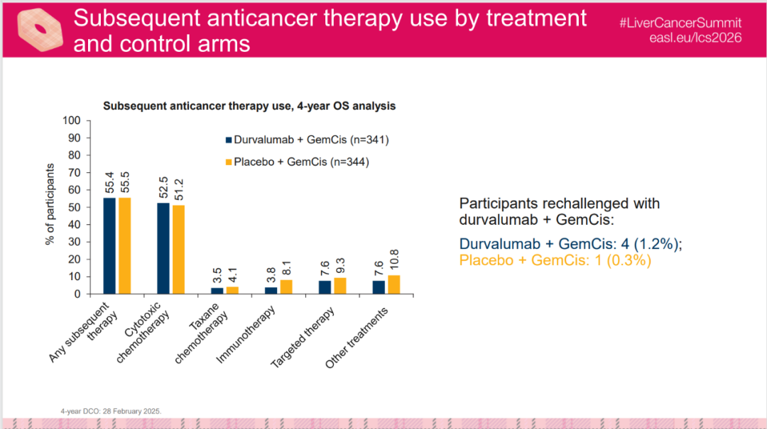 4年随访中,两组患者后续抗肿瘤治疗使用率略有增加,其中度伐利尤单抗组总体后续治疗使用率为55.5%。疾病进展后多数患者选择化疗,其次为靶向治疗,两者占比大致相当(图3)。
