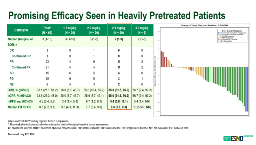 iza-bren(BL-B01D1):一种首创的EGFR×HER3双靶点抗体ADC。在2025年ESMO年会上公布的全球I期临床研究数据显示,该药在转移性或不可切除的NSCLC及其他实体瘤患者中表现出良好的抗肿瘤活性。在2.5 mg/kg剂量下,整体确认的客观缓解率(cORR)达到55.0%。其中,在NSCLC患者中cORR为42.9%(n=14),EGFR突变型与野生型患者的cORR分别为36.4%(n=11)与66.7%(n=3)。该结果初步验证了同时靶向EGFR与HER3这一双抗ADC策略的可行性,为克服现有靶向治疗耐药及治疗泛瘤种提供了新的方向[11]。
