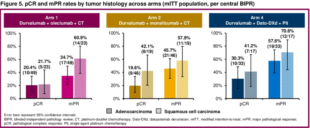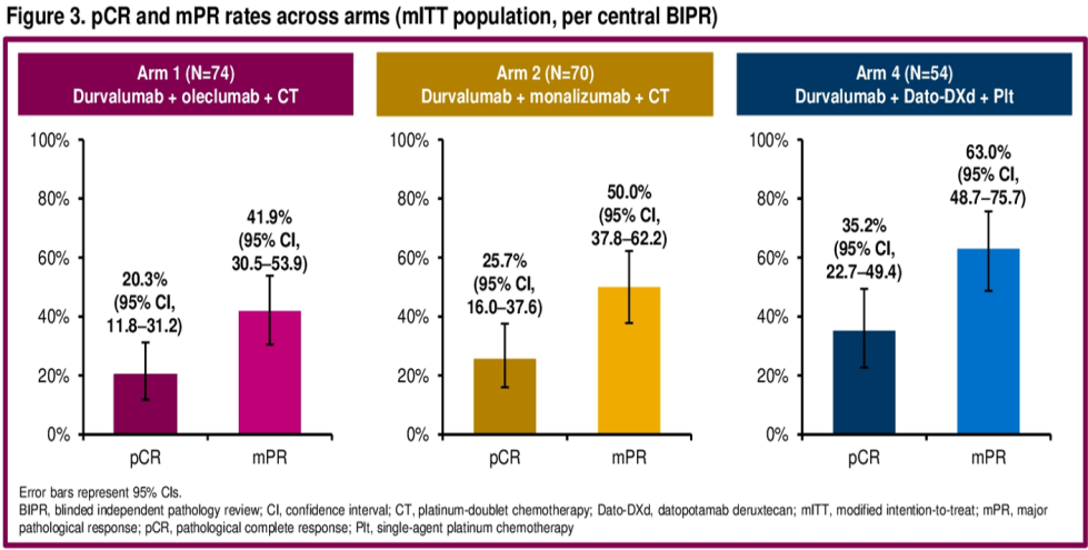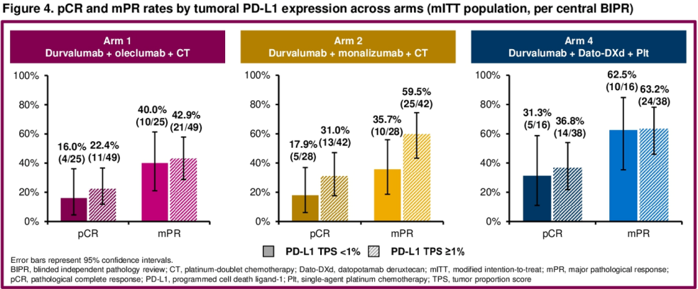结果表明,在可切除IIA-IIIB期NSCLC患者中,度伐利尤单抗联合化疗基础上加入Dato-DXd的围术期治疗可显著提升病理缓解深度,其病理完全缓解(pCR)率达35.2%,优于其他联合方案;主要病理缓解(mPR)率也呈现类似趋势。该方案手术可行性良好(手术率>93%),且安全性可控,为可切除NSCLC的围术期治疗提供了新的潜力策略[18]。