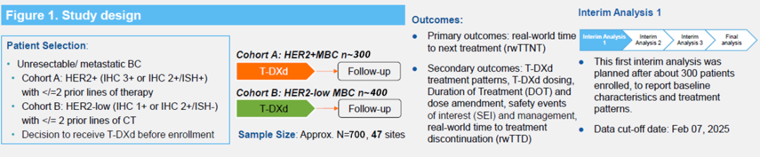 该研究是一项多中心、前瞻性、双队列、观察性真实世界研究,于2024年启动,目前已在中国47家中心入组735例晚期乳腺癌患者,分为两个队列:A队列入组约300例转移性阶段已接受过≤2线系统性治疗的HER2阳性患者,B队列入组约400例转移性阶段接受过≤2线化疗的HER2低表达患者,将系统总结T-DXd使用模式、疗效、耐受性、不良反应管理及患者报告结局(PRO),提供T-DXd应用“本土化证据”。