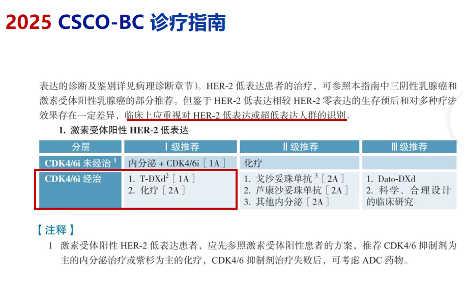 △2025 CSCO BC指南首次单列HER2低表达晚期乳腺癌解救治疗章节,并高级别推荐T-DXd