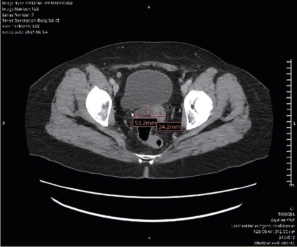 图3:复发时的CT扫描。轴位图像显示5.3厘米×2.4厘米的复杂性低密度囊性病灶。
